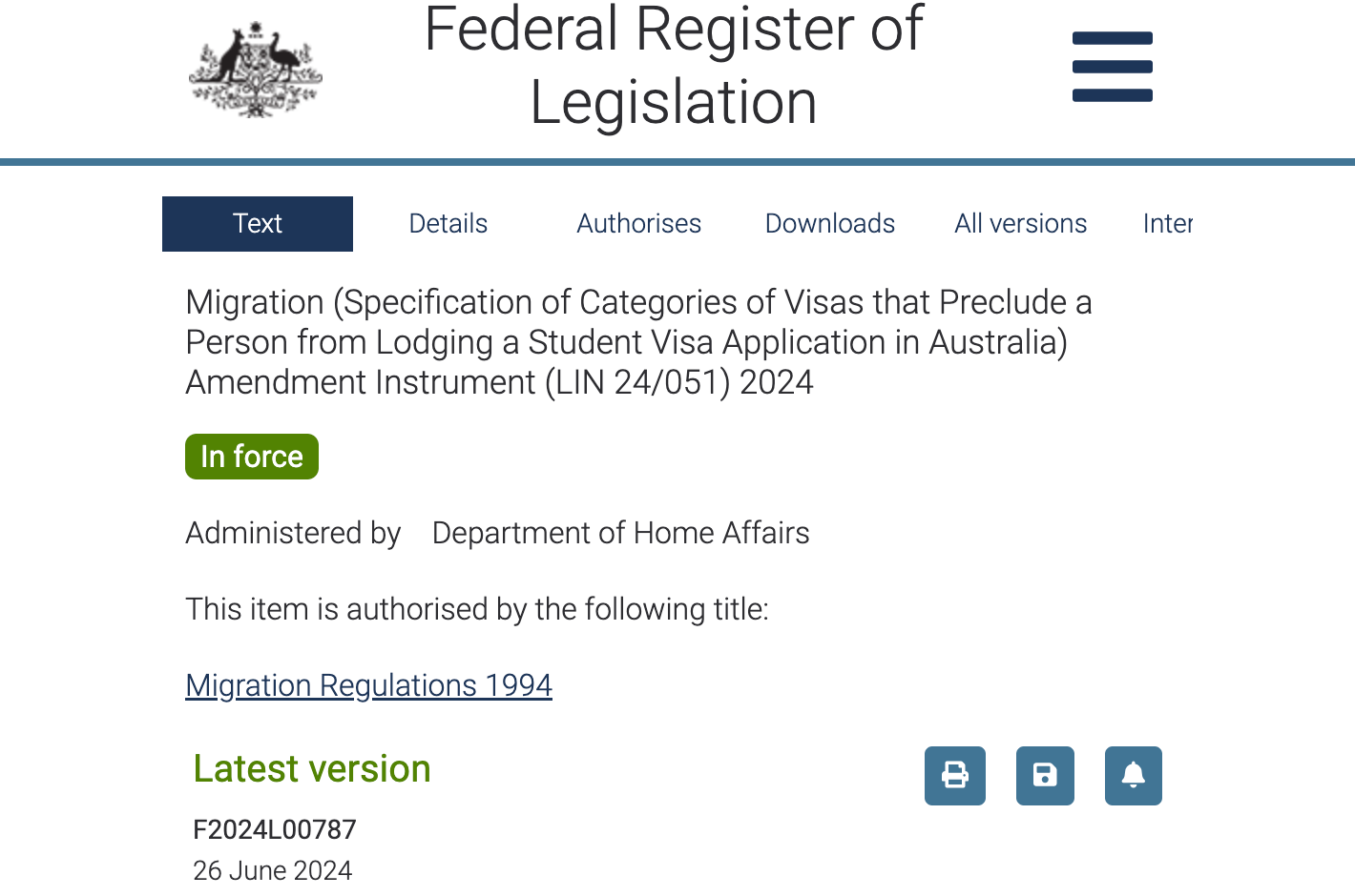 • Instrument Name: Migration (Specification of Categories of Visas that Preclude a Person from Lodging a Student Visa Application in Australia) Amendment Instrument (LIN 24/051) 2024.