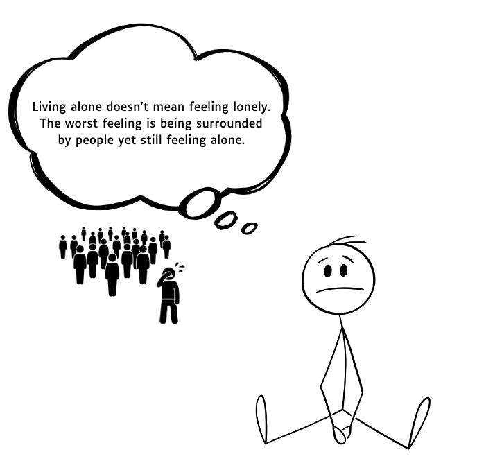 Me: "Living alone doesn't mean feeling lonely. The worst feeling is being surrounded by people yet still feeling alone."